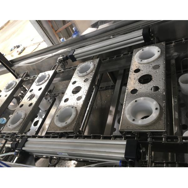 The machine is integrated by disinfection washing, automatic barreling, filling, cap-hanging, capping machine. Filling machine adopts PLC control, precise positioning automatically, complete set of equipment made of high strength stainless steel materials, stainless steel, precision arc welding, variations small, beautiful welding lines; Transmission parts are stainless steel structure to ensure the normal operation of the machine in a variety of environments; non-metallic parts are made of PP plastic and other non-toxic and high wear-resistant materials carefully processed; drive motor, booster are domestic export series stainless steel products, electrical components adopt imported or domestic brand-name series of hardcover series to make it more stable and reliable. The equipment consists of washing, filling, capping, which is suitable for 3-5 gallon barreled pure water filling. Inside washing using four independent control of a single row of high pressure jet wash, rinse for up to 20 seconds. The whole washing, filling and capping process using PLC programmable automatic computer control system, and this equipment has a catenation, signal, self-test and other safety devices. Features: The whole machine is made from high quality stainless steel, reasonable structure, easy and accurate operation, which is the ideal equipment for the barreled drinking water production line.